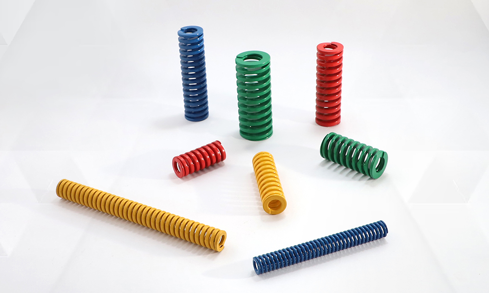Die springs, or high force compression springs, are engineered to endure exceptional levels of applied stress and maintain performance under extreme conditions. These robust springs can handle up to 30% more stress compared to standard compression springs and are effective even in environments with temperatures reaching up to 475 degrees Fahrenheit. Crafted from rectangular or square wire, die springs possess distinctive features due to their unique wire shape. The larger cross-sectional area of rectangular and square wire enhances the spring's strength and load-bearing capacity. After coiling, die springs are stress-relieved, pre-set, and shot peened to maximize their fatigue life. The ends are precisely ground and finished with a powder coating in solid colors. Each group of die springs is categorized by load range and identified through a color-coding system for easy selection.
